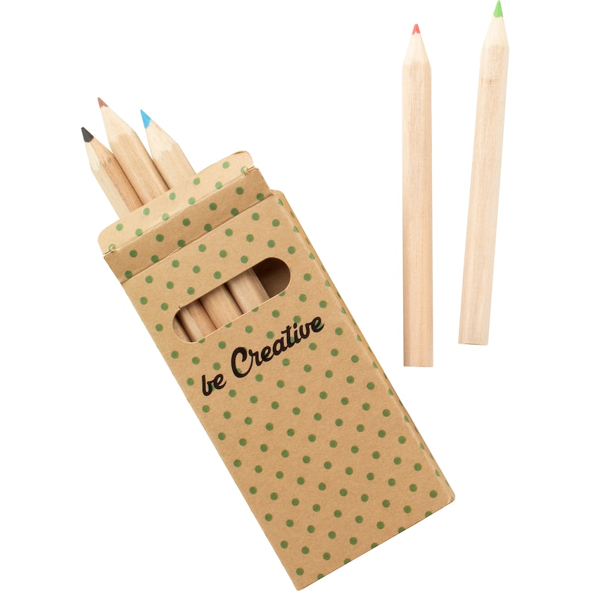Farveblyanter i en emballage som trykkes helt efter dine ønsker. Monica indeholder 6 stk. farveblyanter i forskellige farver. Hele emballagens overflade trykkes helt efter dine instruktioner.