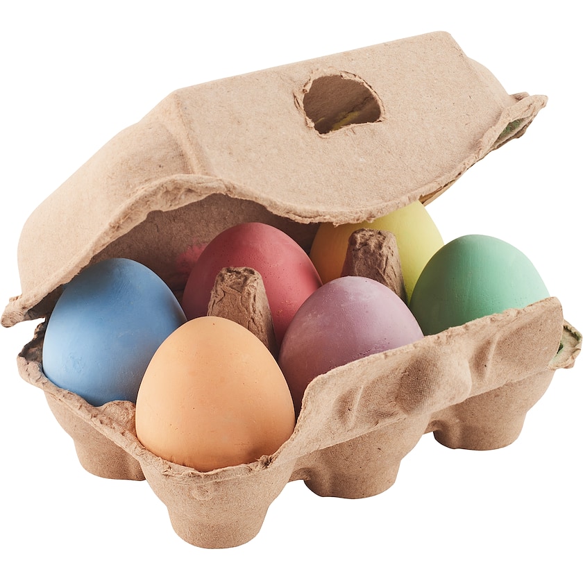 Sjovt sæt med 6 farvekridt i æggekarton. En sjov gave! Men forveksle dem ikke med rigtige æg. Kun 1-farvetryk er muligt.
