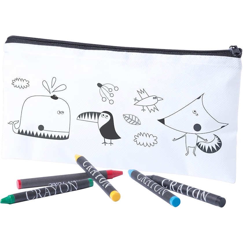 Sættet indeholder farveblyanter og et penalhus. Penalhuset har et fortrykt motiv som kan farvelægges.