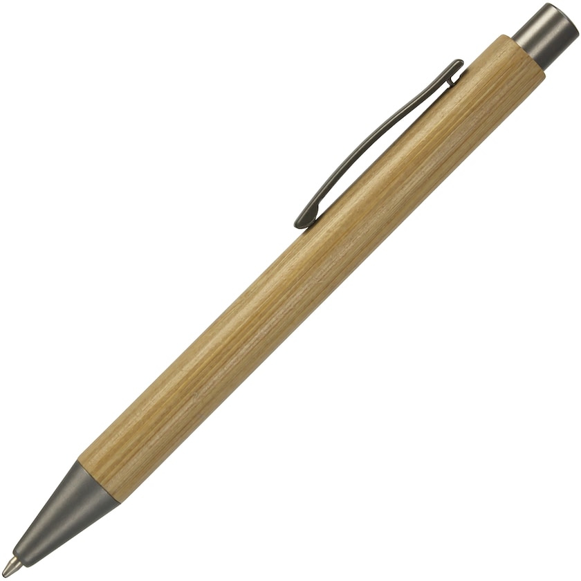 Kuglepen i bambus med clips af metal. Detaljerne er lakerede i en mørkegrå metalfarve. Kuglepennen er et godt miljøvalg da bambus er et miljøvenligt materiale som dyrkes klima effektivt.