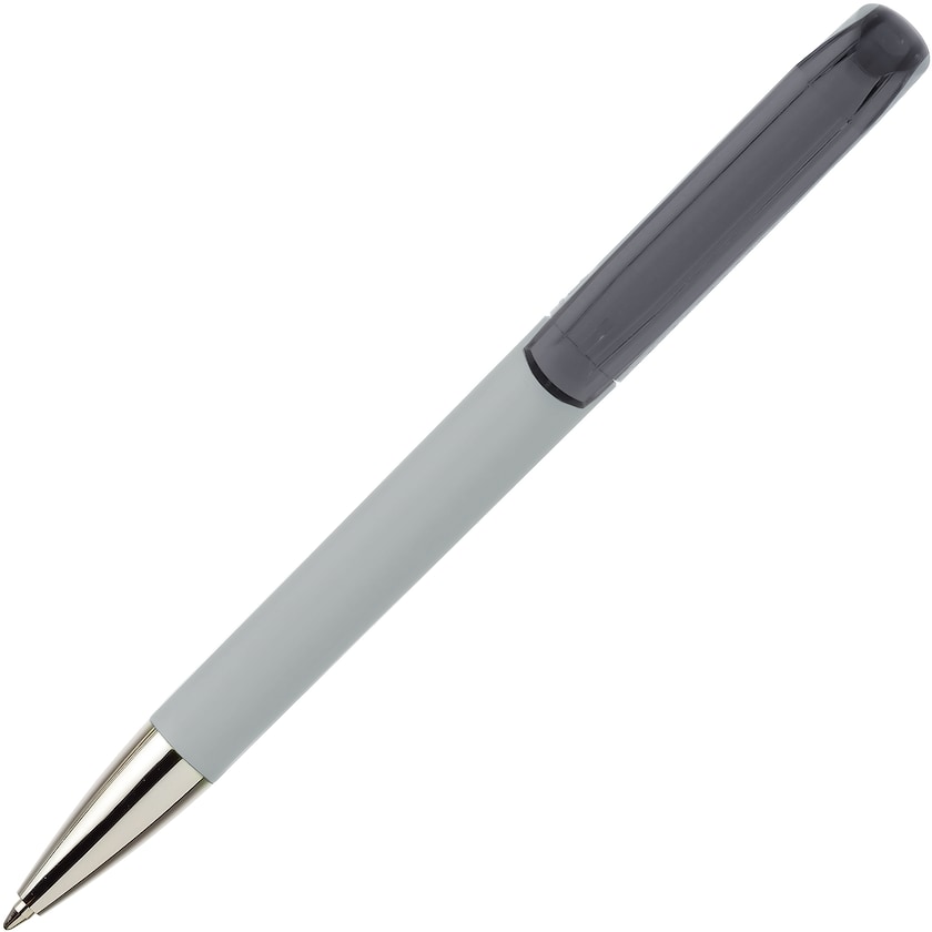 Højkvalitets kuglepen med pennekrop i gummi. Pennen har blankpoleret metalspids og transparent clips der kan laves logotryk på.
