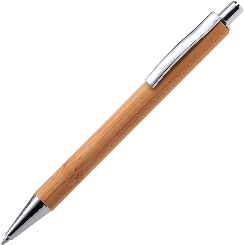 Kuglepenne i ægte bambus og med detaljer i metal. Simone er med blåt blæk. Mærkningen kan enten laves med tryk eller lasergravering. En stilren kuglepen med naturligt look.