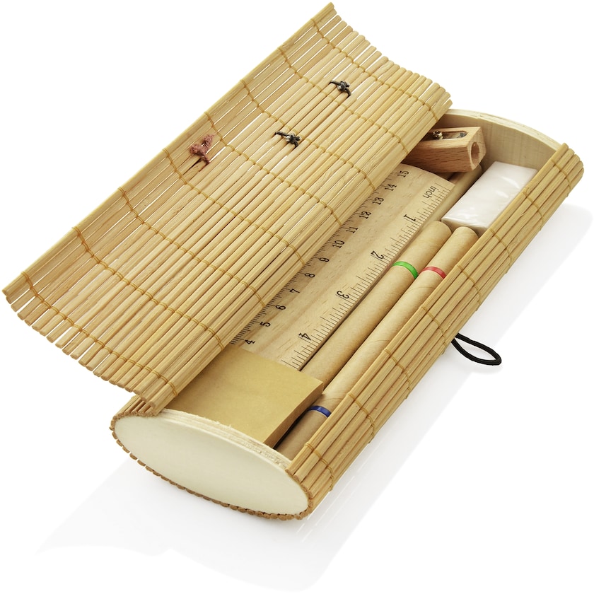 Flot pennesæt af bambus. Pennesættet indeholder to kuglepenne med rødt, hvidt, sort og grønt blæk, to blyanter, viskelæder, blyantspidser og lineal i træ. Mærkning sker med lasergravering på en træbrik på selve penneetuiet.