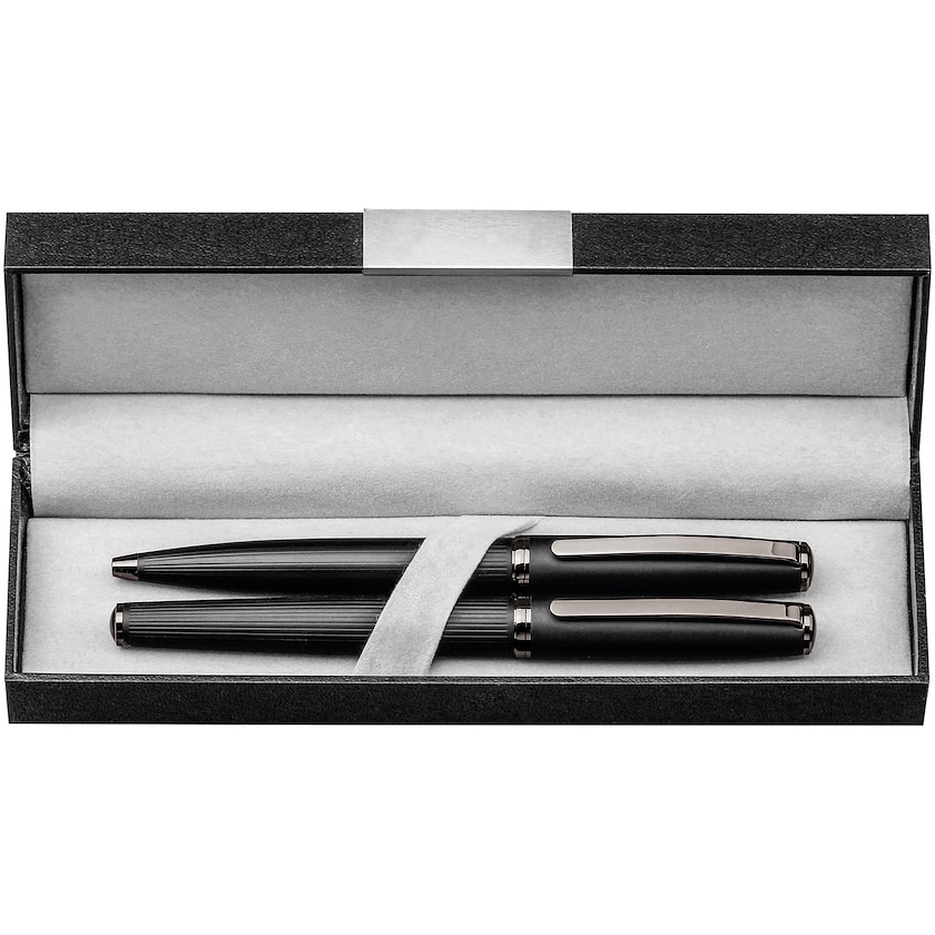 Eksklusivt sæt med to kuglepenne i metal. Den ene er en kuglepen og den anden er en fyldepen. Begge penne har blåt blæk. Mærkningsprisen henviser til tryk eller lasergravering på den ene af pennene.