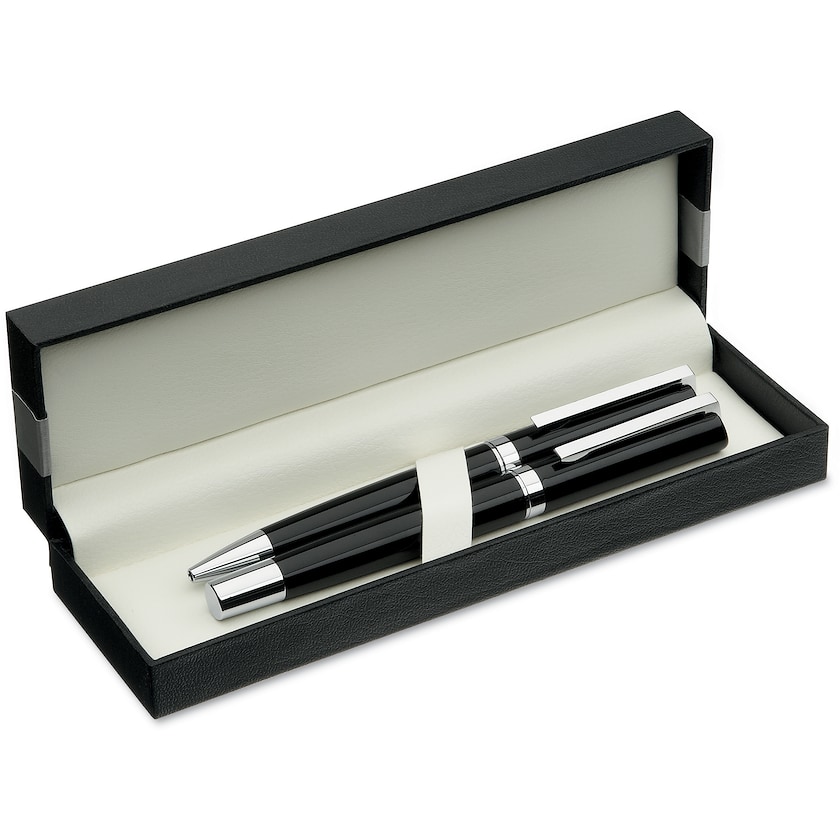 Sort pennesæt i flot gaveæske. Sættet består af en kuglepen og en fyldepen. Tryk kan maksimalt ske i én farve.
