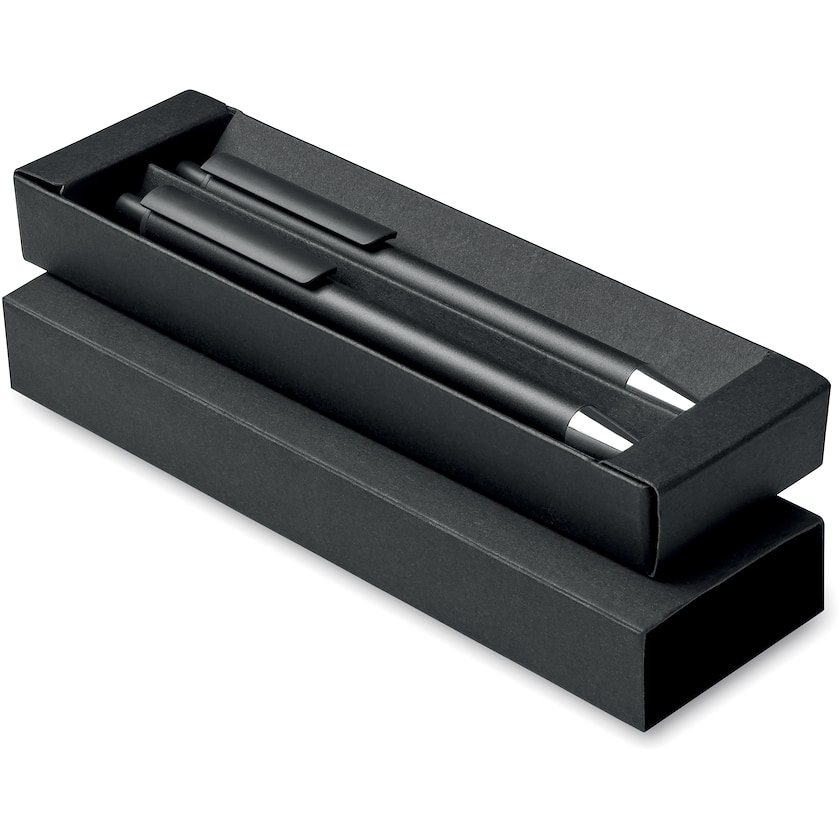 Pennesæt med en kuglepen og en grafitblyant. Kuglepennen har blåt blæk. Leveres i gaveæske lavet af genbrugspapir.