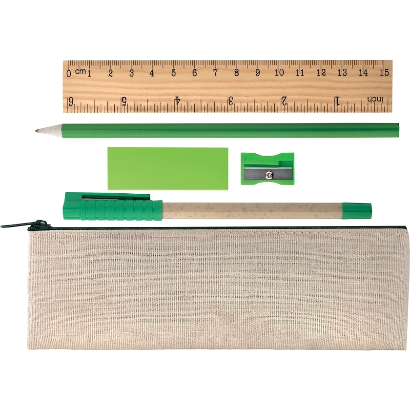 Pennesæt i 6 dele. Sættet består af linial i bambus, blyantspidser i træ, viskelæder, blyant af pap, kuglepen, samt et penalhus af jute og bomuld. Kuglepennen har blåt blæk. Trykket sker på penalhuset.
