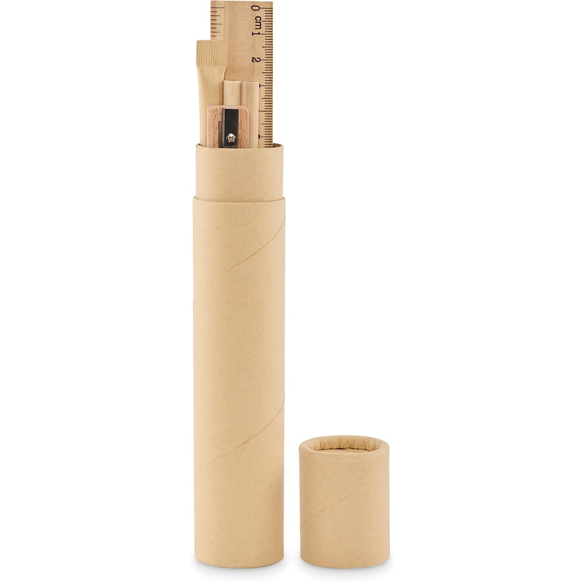 Kuglepensæt i naturfarvet paprør. Sættet indeholder 2 blyanter, 1 kuglepen, 1 blyantspidser og 1 væskelæder. Trykket laves på paprøret.