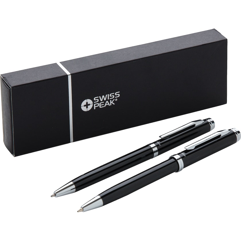 Sæt med to metalkuglepenne fra Swiss Peak. Pennesættet indeholder en kuglepen med blåt blæk og en stiftpen med en 0,7 mm stift. Kuglepennen har en tysk blækpatron som skriver 1200 m. Mærkningsprisen henviser til tryk eller lasergravering på den ene af pennene.