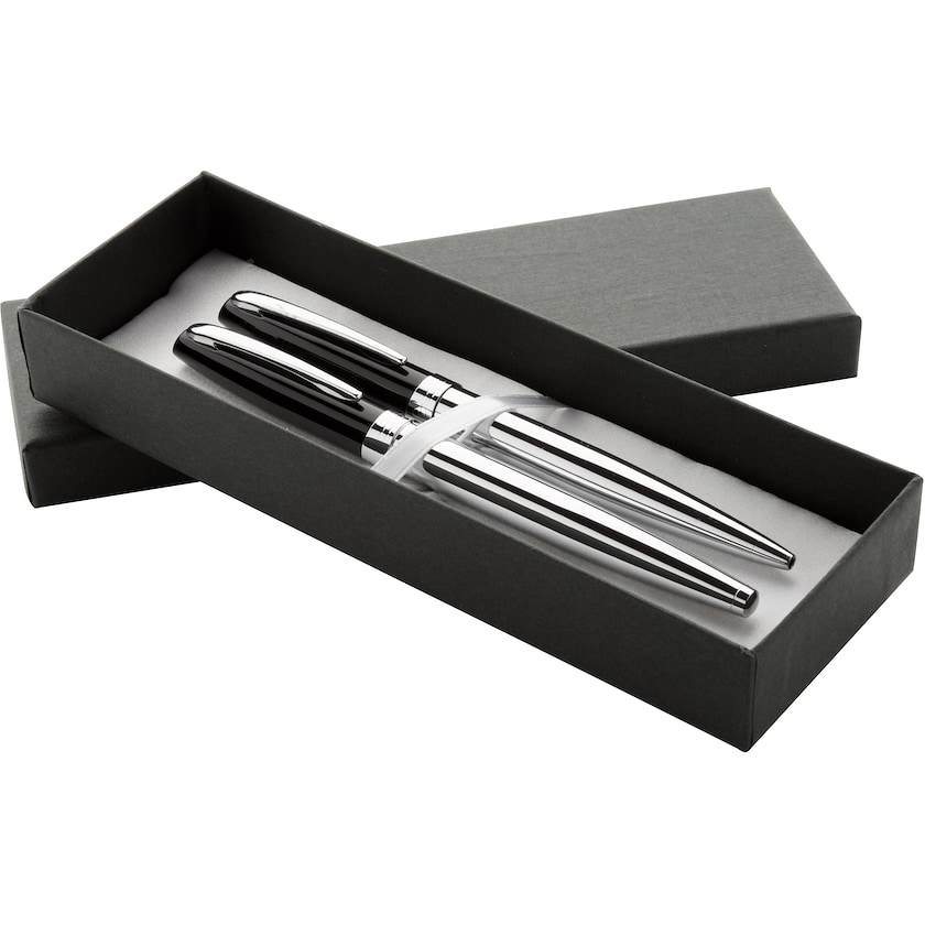 Elegant pennesæt bestående af en kuglepen og en fyldepen. Kuglepennene har kromede detaljer og blåt blæk. Leveres i en sort gaveæske.