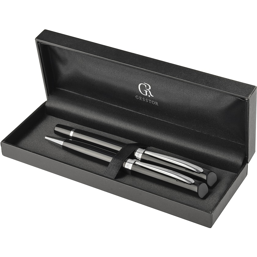 Klassisk designet pennesæt. Sættet indeholder en kuglepen og en blækpen i metal. Begge kuglepenne har sort blæk. Graveringsprisen henviser til mærkning på en af pennene.