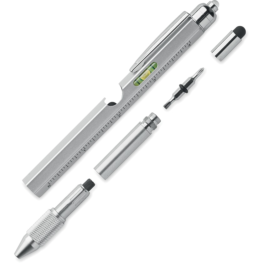 Kuglepen i rustfri stål med flere smarte funktioner. Catlin indeholder, udover kuglepen, også lineal, vaterpas, bits til skruetrækker med Phillips- og flathead skruetrækker samt lampe. 3 stk. AG-batterier inkluderet. Håndværkerens bedste følgesvend.