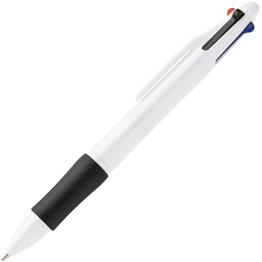 Kuglepen med sort, blå, rød og grøn blæk. Multikuglepennen Keith har et gummigreb som gør den behagelig at skrive med. Fremstillet af ABS.