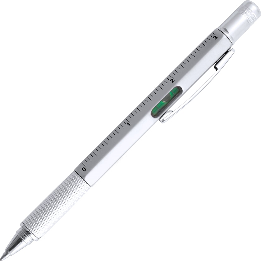 Kuglepennen med vaterpas, lineal og skruetrækker. Tomball har en blå blækpatron. Trykket kan maksimalt udføres i to farver.