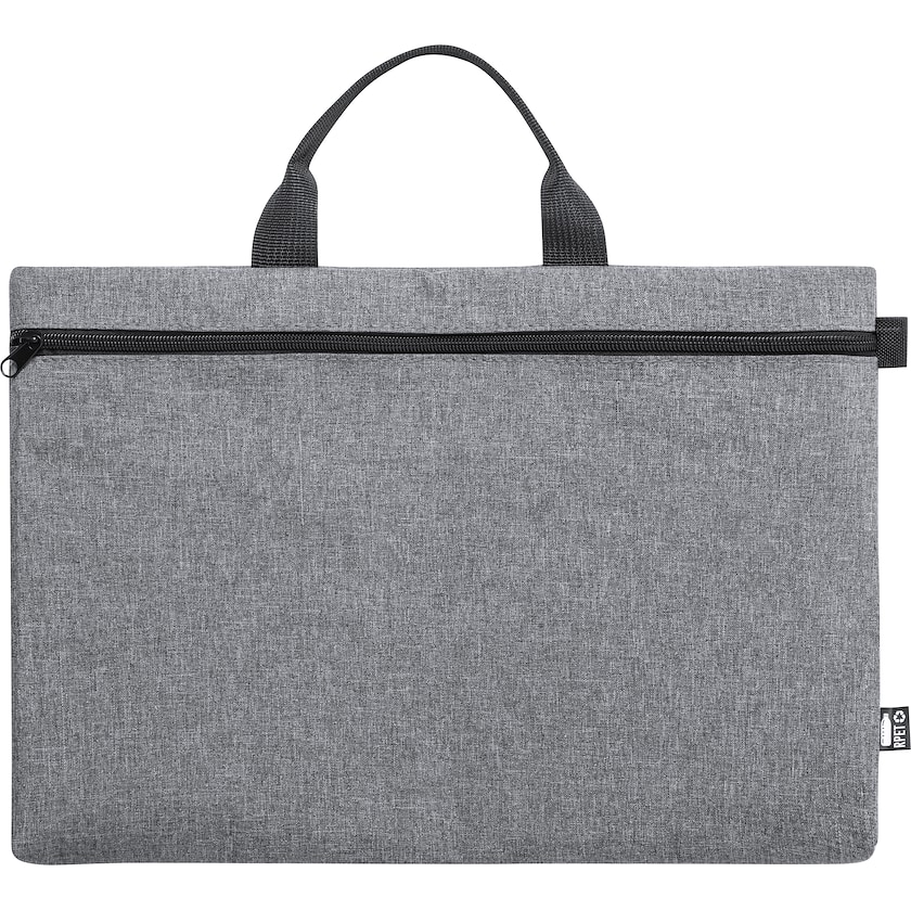 Miljøvenlig dokumenttaske i rPET. Tasken et hovedrum med lynlås. På siden er der en etiket som viser at tasken er fremstillet af rPET. Materialet rPET er fremstillet af genbrugs PET-flasker.