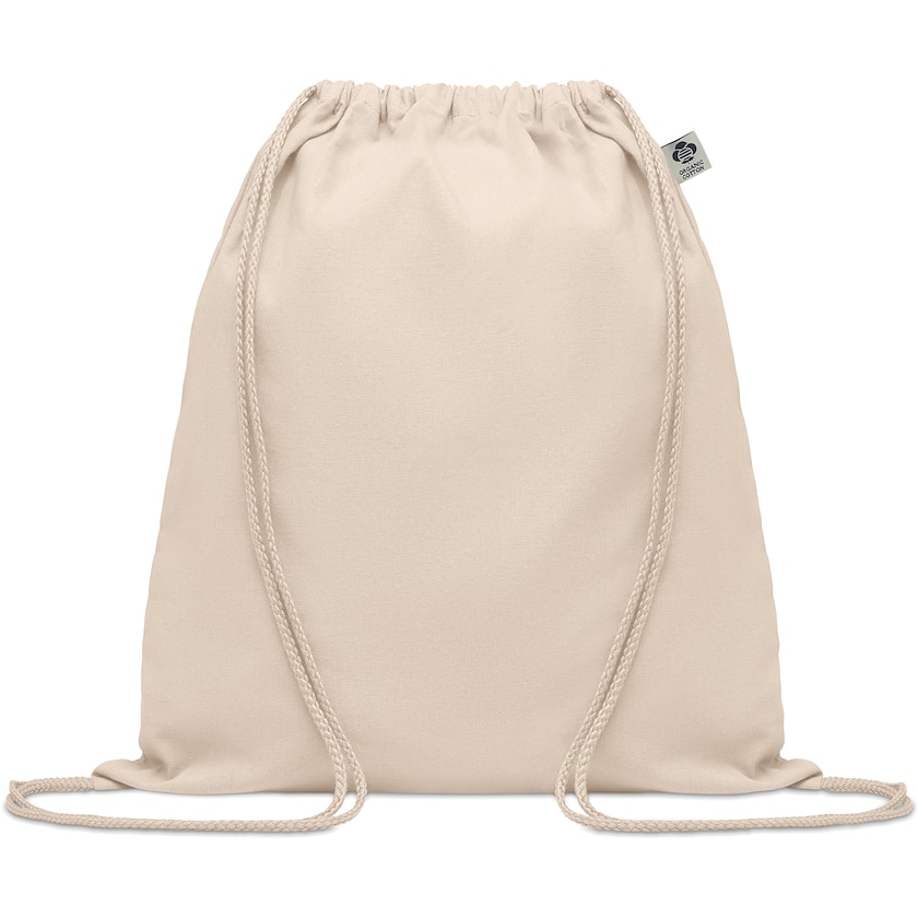 Gymnastikpose i naturfarvet økologisk bomuld. Stoffet har en vægt på 140 gram/m². På den ene side er der en etiket som viser at gymnastikposen er fremstillet af økologisk bomuld.
