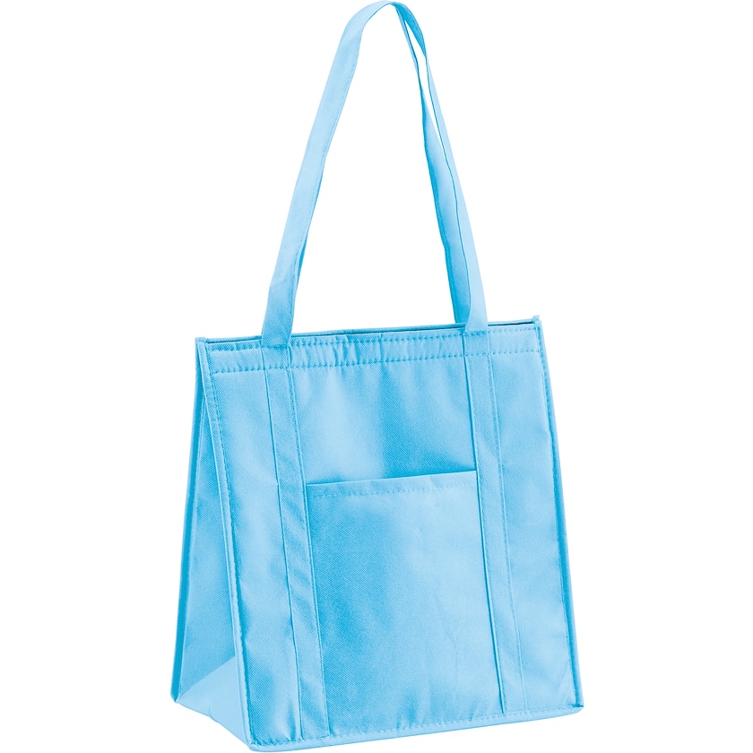 Billig køletaske i non-woven-materiale. Køletasken kan rumme op til 10 liter og holdes lukket ved hjælp af et velcrobånd.