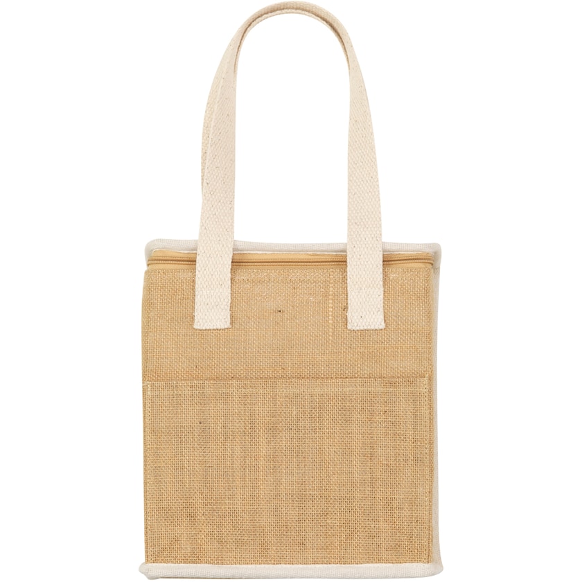 Køletaske med logo af jute og bomuld. Foran er der en lomme til mindre genstande. Køletasken kan rumme ca. 8 liter. Kun 1-trykfarve er mulig.