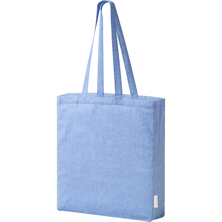 Mulepose med bred bund som er fremstillet af genbrugsbomuld. Cannes har lange hanke som gør den let at bære henover skulderen. Posen er forsynet med en etiket som viser at den er fremstillet af 100% genbrugsbomuld.