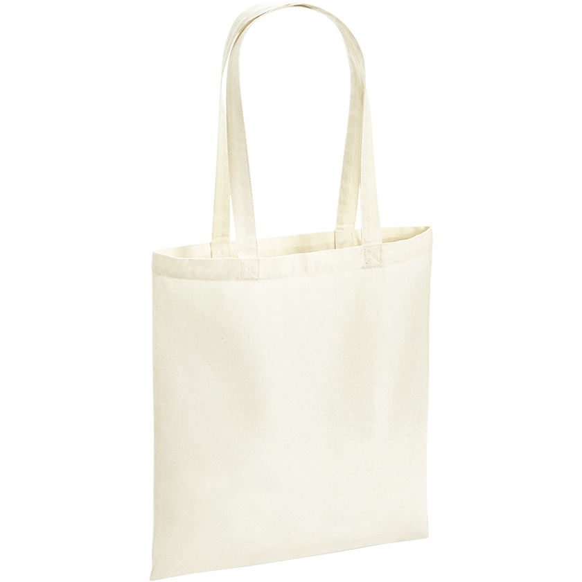 170 grams bomuldspose i genbrugsbomuld. Bomulden er GRS-certificeret ifølge Control Union CU811033. Bomuldsposen rummer 10 liter. Håndtag er 67 cm i længden, hvilket betyder at man enten kan bære den i hånden eller over skulderen.
