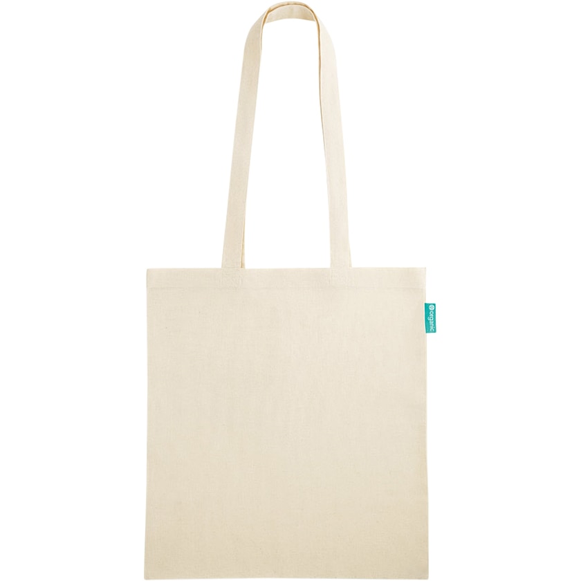 Bomuldspose i 100% økologisk bomuld. Bomulden er fremstillet under bæredygtige forhold uden kemikalier eller pesticider. Håndtag er 60 cm i længden. På den ene side er der en etiket som viser at posen er fremstillet af økologisk bomuld.