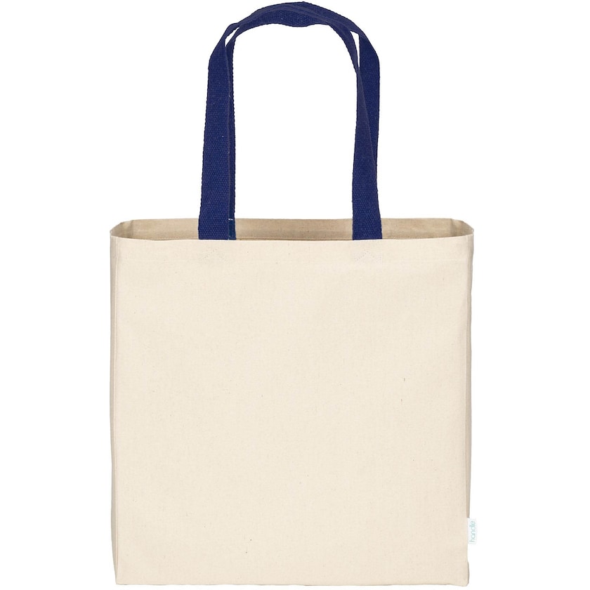 280 grams bomuldspose med bred bund. Port Augusta er fremstillet af 80% GRS-certificeret genbrugsbomuld samt 20% genbrugspolyester. Hankene er lange nok til at bære tasken både i hånden og over skulderen.