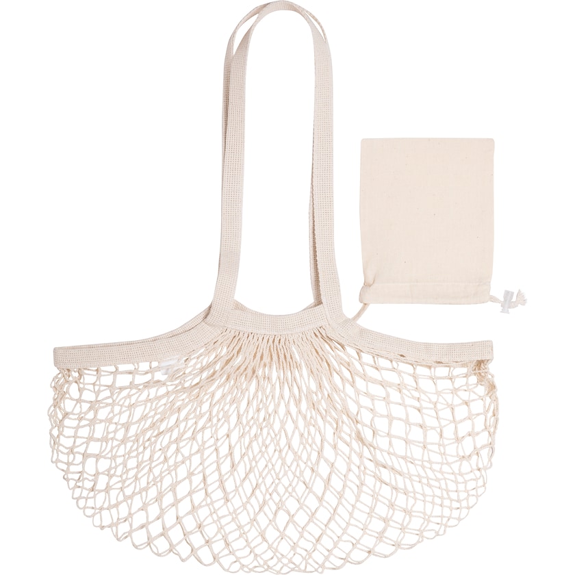 Netpose i naturfarvet bomuld. Når posen ikke bliver brugt, kan den foldes sammen og opbevares i den tilhørende opbevaringspose. Trykket laves på opbevaringsposen.