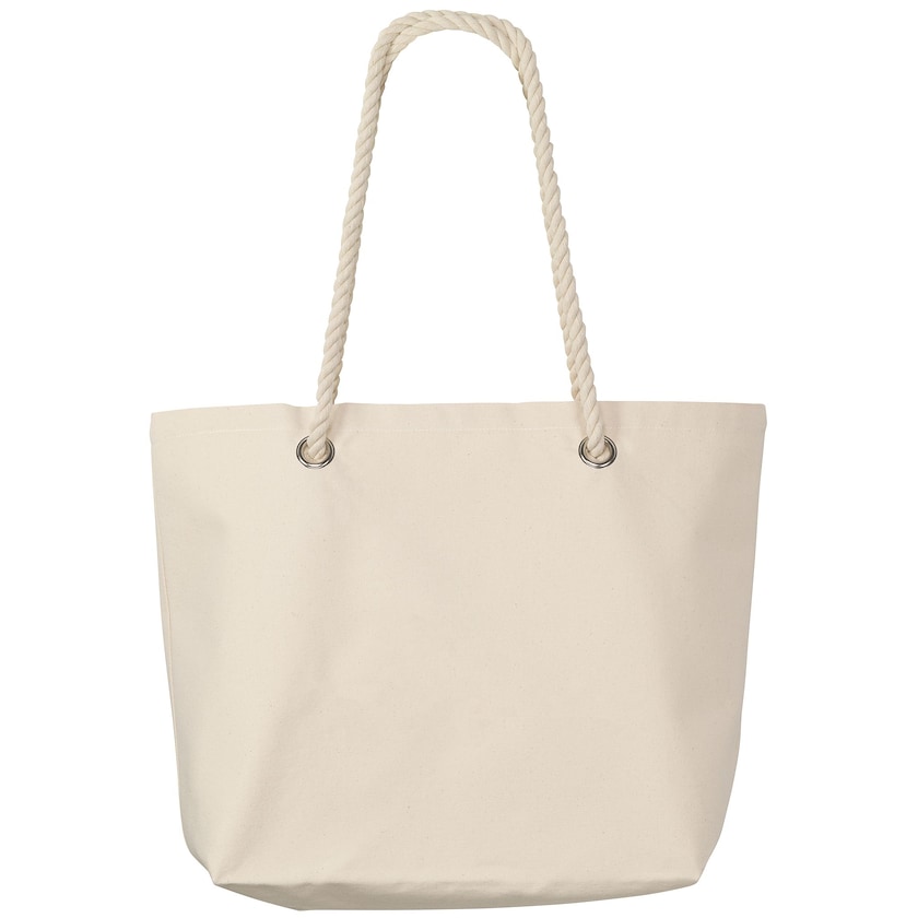 Eksklusiv bomuldspose med rebhåndtag. Indvendigt er der en lomme med lynlås. Perfekt til indkøbsturen eller stranden. Kun 1-trykfarve er mulig.
