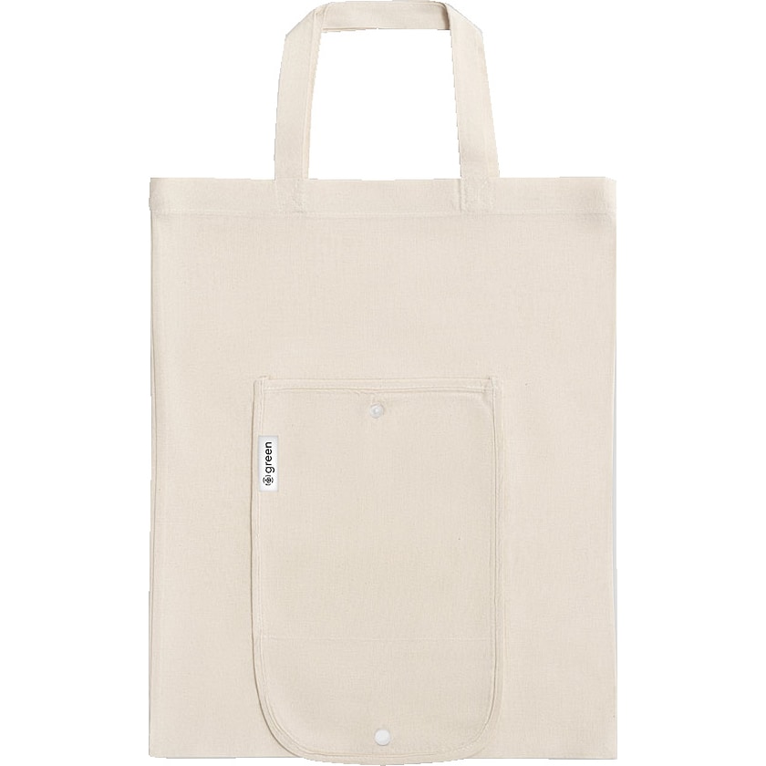 Sammenfoldelig bomuldspose i genbrugsmateriale. Stoffet er lavet af 50% genbrugsbomuld og 50% almindelig bomuld. Håndtag er 38 cm i længden.
