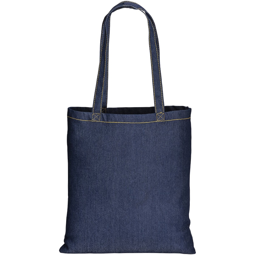 Mulepose med denimstof af genbrugsbomuld. Denimstof og de gule søm giver muleposen et unikt og attraktivt udseende.