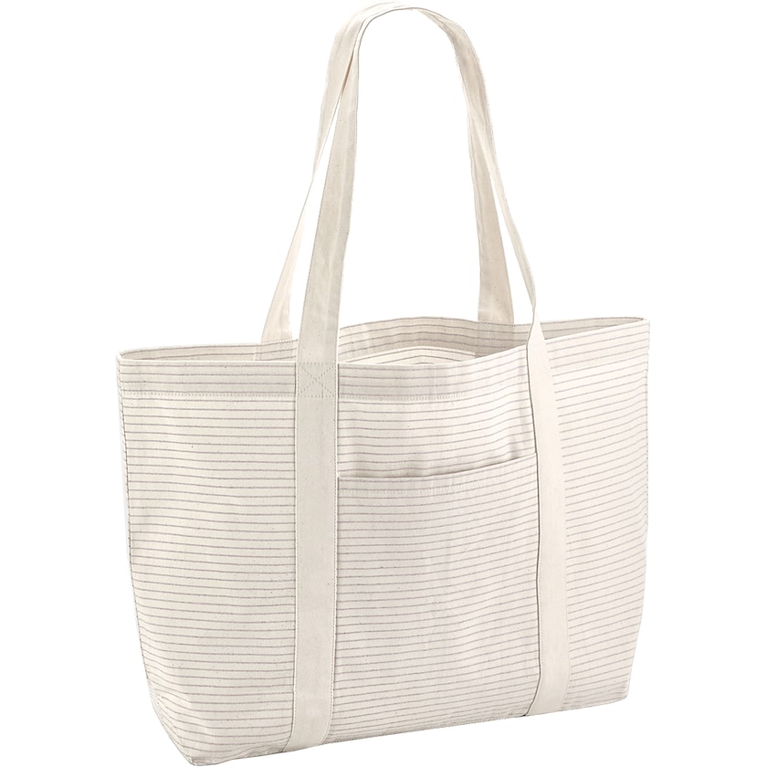 Flot bomuldspose med stribet stof. Posen er fremstillet af et kraftigt 200 grams stof af økologisk bomuld. Foran er der en rummelig lomme. Kan bæres over skulderen eller i hånden.
