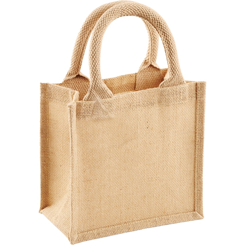 Lille jutepose som passer perfekt som gavepose. Juteposen har lamineret stof for øget slidstyrke. Bærehåndtaget er af bomuld. Tryk kan laves i op til to farver.