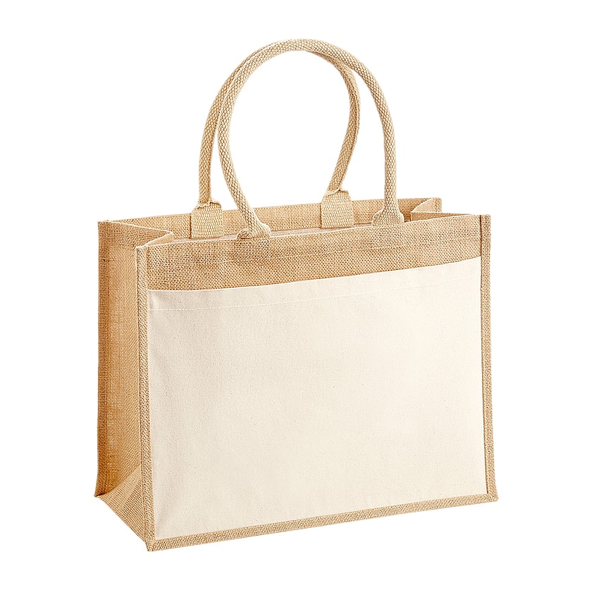 Rummelig jutepose med praktisk opbevaringslomme på forsiden. Jutestoffet er lamineret hvilket øger posens styrke. Håndtag og opbevaringslomme er produceret i naturfarvet bomuld. Håndtaget har en længde på 55 cm. Et perfekt valg til dig der leder efter en rummelig jutepose med tryk!