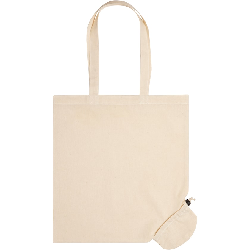 Miljøvenlig mulepose i økologisk bomuld. Når muleposen ikke anvendes kan den foldes sammen til en lille bomuldsbold.