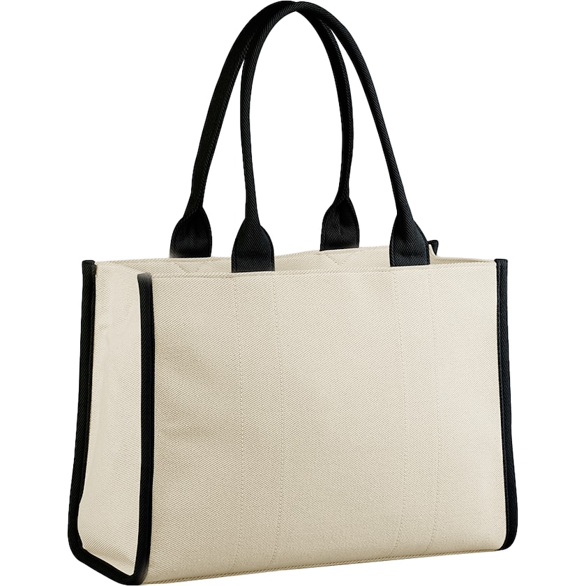 Luksus strandtaske med kraftig stof. Indvendigt er der en lomme forsynet med lynlås. Kan både bæres over skulderen og i hånden. Stoffet er fremstillet af en solid blanding af bomuld og polyester. Foret er fremstillet af genbrugspolyester.