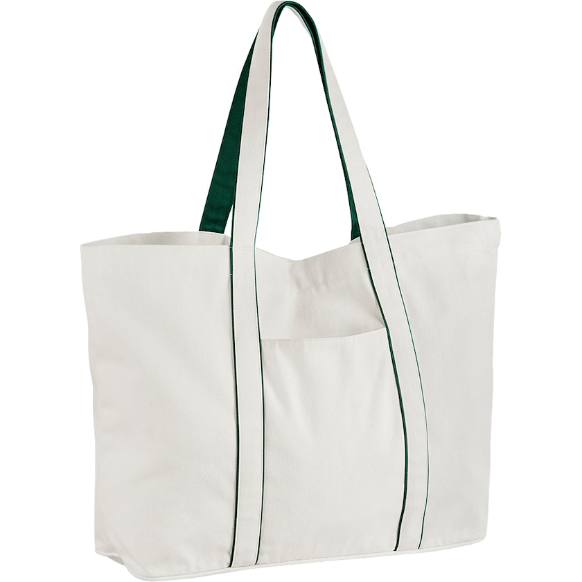 Miljøvenlig strandtaske af kraftig bomuldsstof. Hovedrummet lukkes med magnetlås. På ydersiden er der en skjult lomme til værdigenstande. Tasken kan både bæres over skulderen og i hånden. Stoffet vejer 407 gram/m2 og er fremstillet af 70% genbrugsbomuld og 30% post-consumer-polyester.