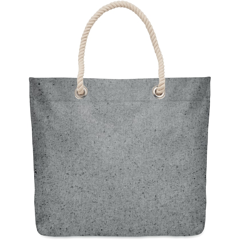 Strandtaske af genbrugsbomuld med kraftige snørehåndtag. Stoffet er fremstillet af 80% genbrugsbomuld samt 20% almindelig bomuld.
