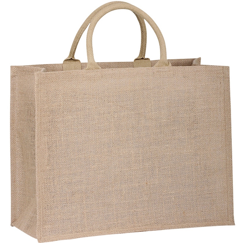 Jutepose med logo med korte bærehåndtag. Takket være et godt format og en kraftig bund, passer den godt til at bære tungere og mere pladskrævende ting. Jute er desuden et miljøvenligt materiale, hvilket gør posen til et godt miljøvalg. Da jute er et meget grovt materiale, er det kun muligt at trykke enklere motiv.