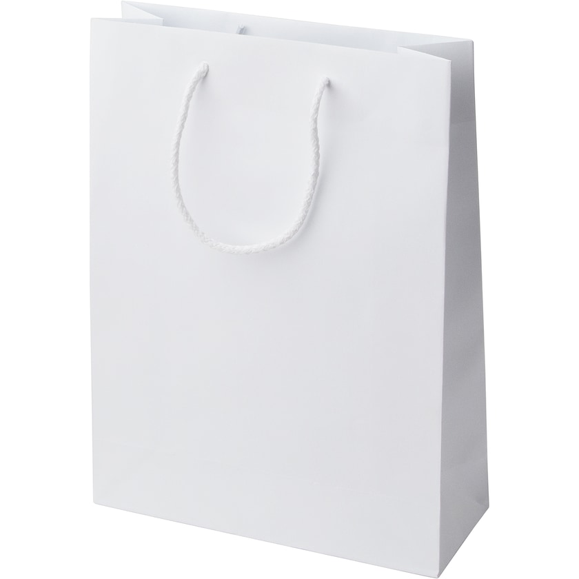 Eksklusiv papirspose med snørehåndtag. Fås i både hvid og brun. Trykprisen henviser til tryk på en af siderne.