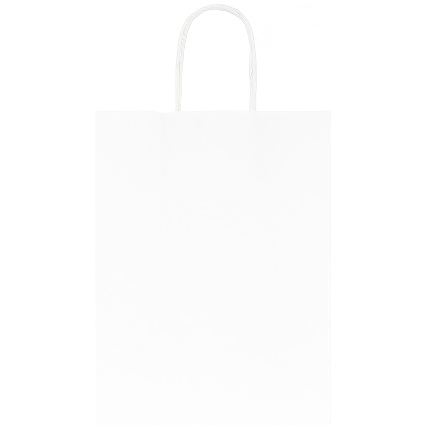 Digitaltrykt hvid papirpose. Hankene er snoede og forstærkede. Papirposen kan klare en maksimal vægt på 6 kg. Da posen er digitaltrykt, er leveringstiden kort.