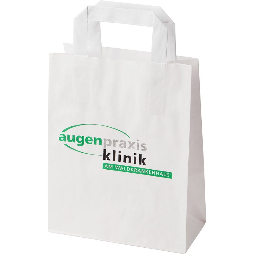 Lille papirspose med flade håndtag. Posen er produceret af almindeligt papir og trykprisen henviser til tryk på en af siderne.
