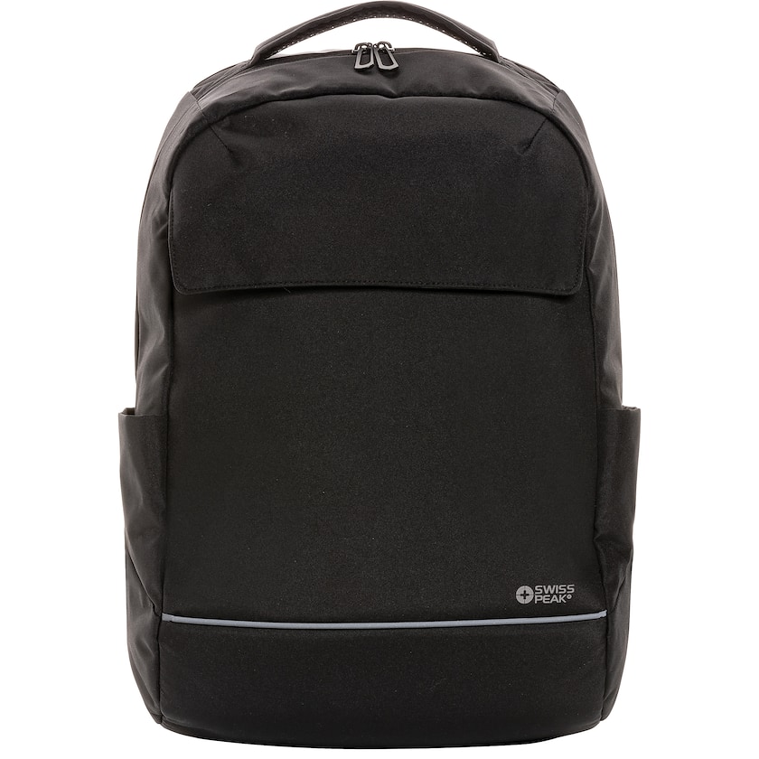 Stilfuld computerrygsæk fra Swiss Peak. Indvendigt er der et foret rum til en 15,6 tommers bærbar. Rygsækken er fremstillet af rPET (genbrugte PET-flasker) og er dermed et godt miljøvalg.