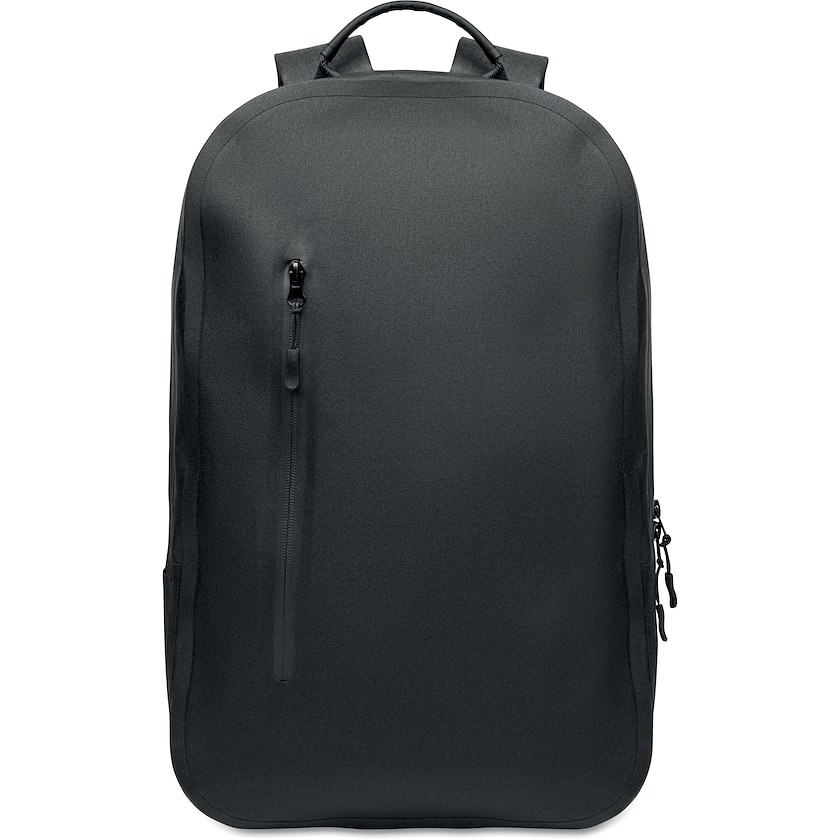 Computerrygsæk med vandafvisende stof. Indvendigt er der et foret rum til en 16 tommers bærbar. Yderstoffet er lavet af miljøvenligt rPET. Foran er der en lomme med lynlås.