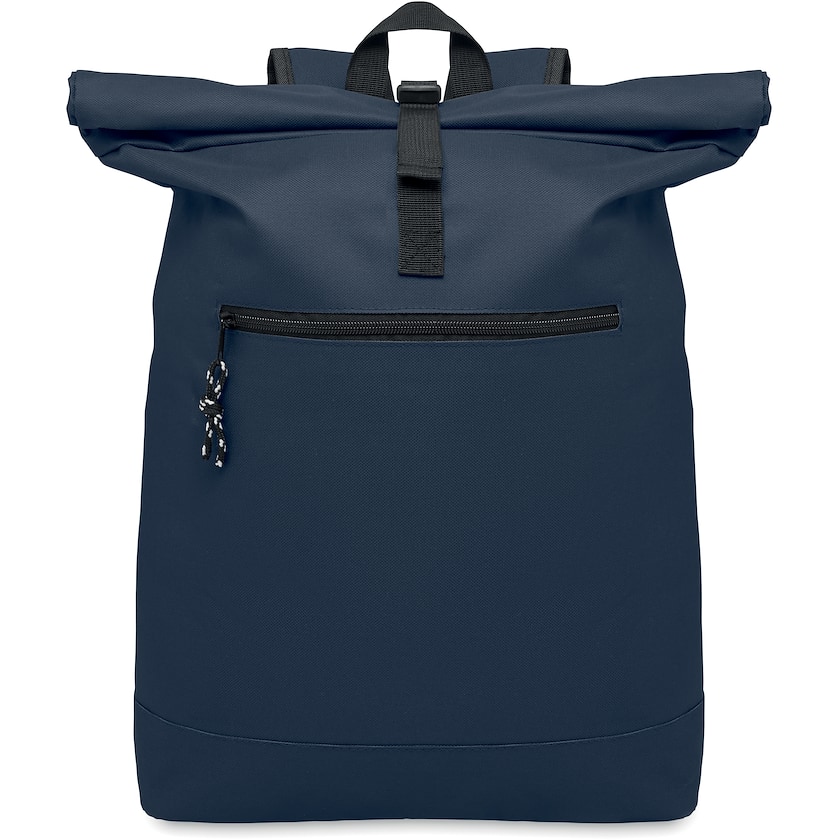 Billig roll-top-rygsæk med logo. Indvendigt er der en foret lommer til en 15 tommers bærbar. Ryggen og stropperne er foret. Foran er der en lomme med lynlås.