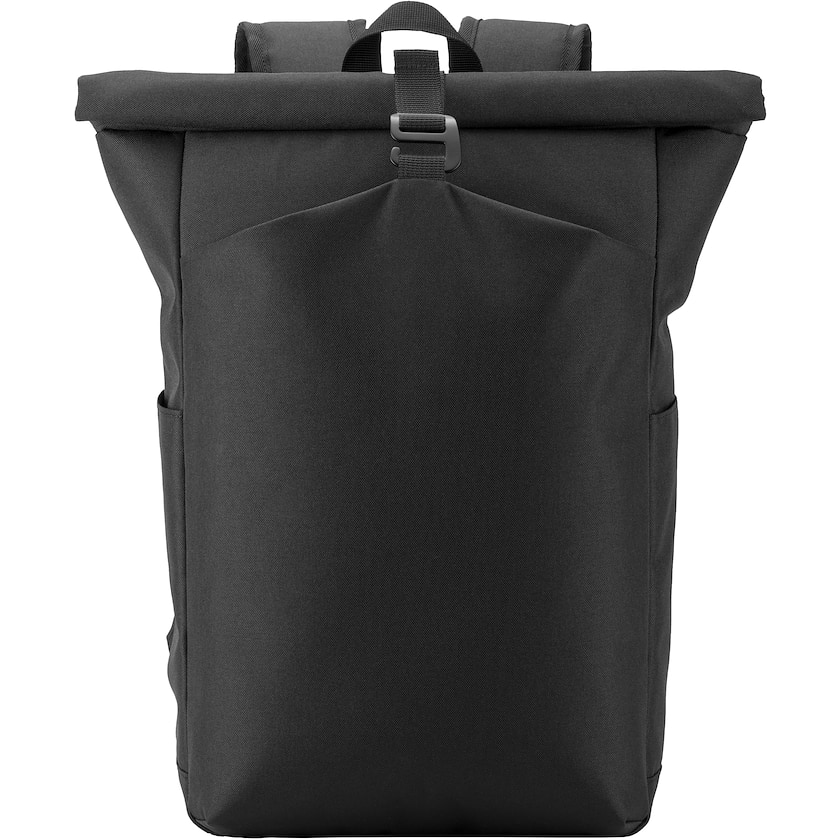 Billig roll-top-rygsæk med logo. Rygsækken har et rum som kan rumme en 15 tommers bærbar. På siderne er der lommer til vandflasker. Bagside samt stropper er behageligt foret. Tryk kan kun laves i en farve.
