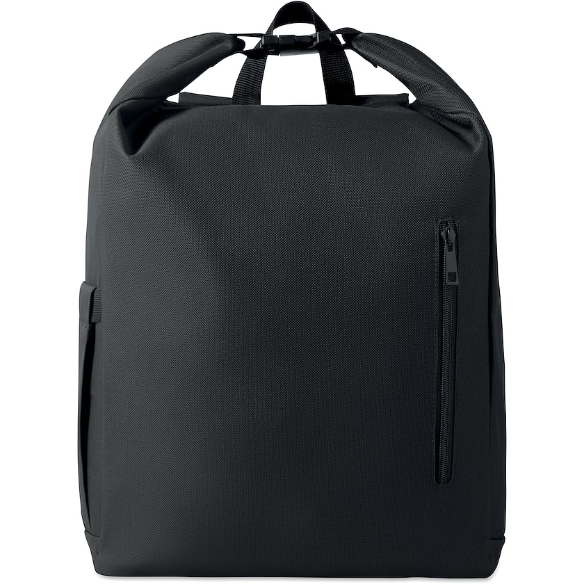 Roll-top-rygsæk af miljøvenligt rPET-stof. Indeni er der et polstret rum til en 15 tommer bærbar computer. På forsiden er der en lynlåslomme, og på den ene side er der en elastisk sidelomme.