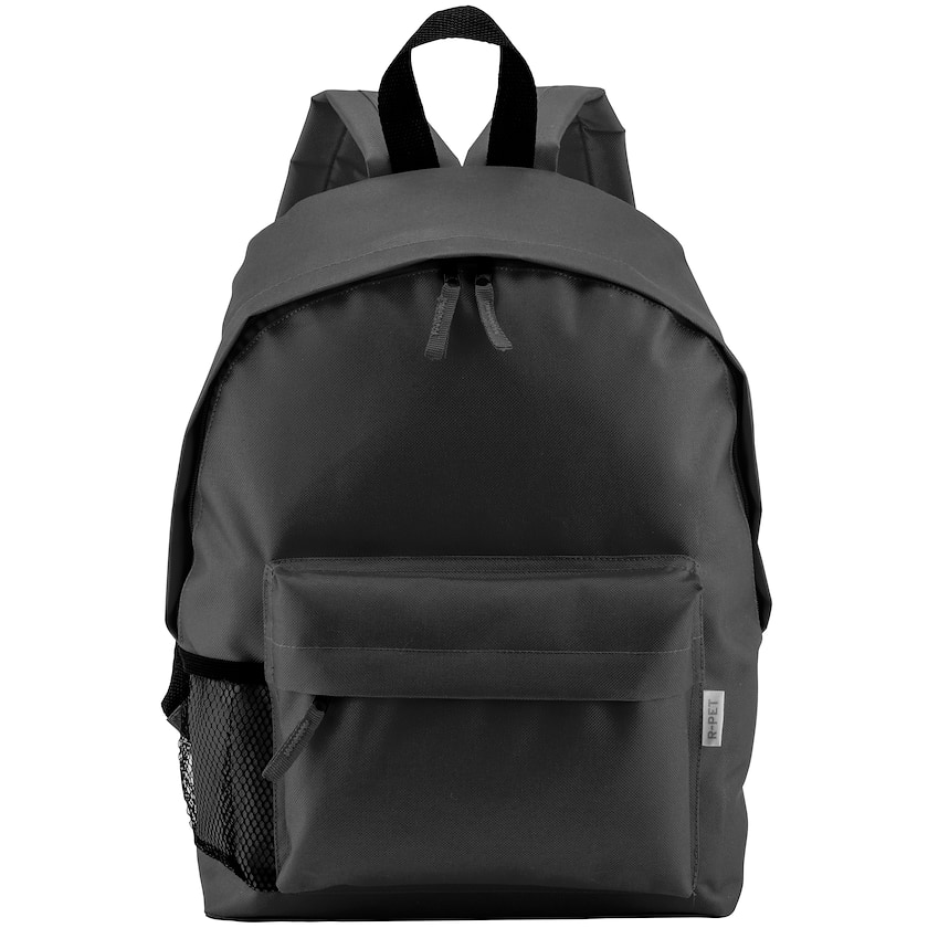 Billig rygsæk af miljøvenligt rPET. Bagsiden er foret og på siderne er der netlommer til drikkedunke.