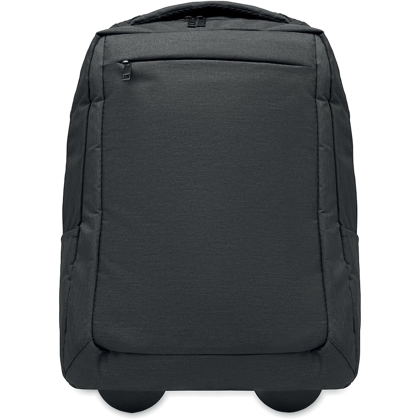 Trolley-rygsække af genbrugsmateriale. Indvendigt er der et foret rum til en 15 tommers bærbar. Foran er der en lomme med lynlås og på siderne to mindre lommer.