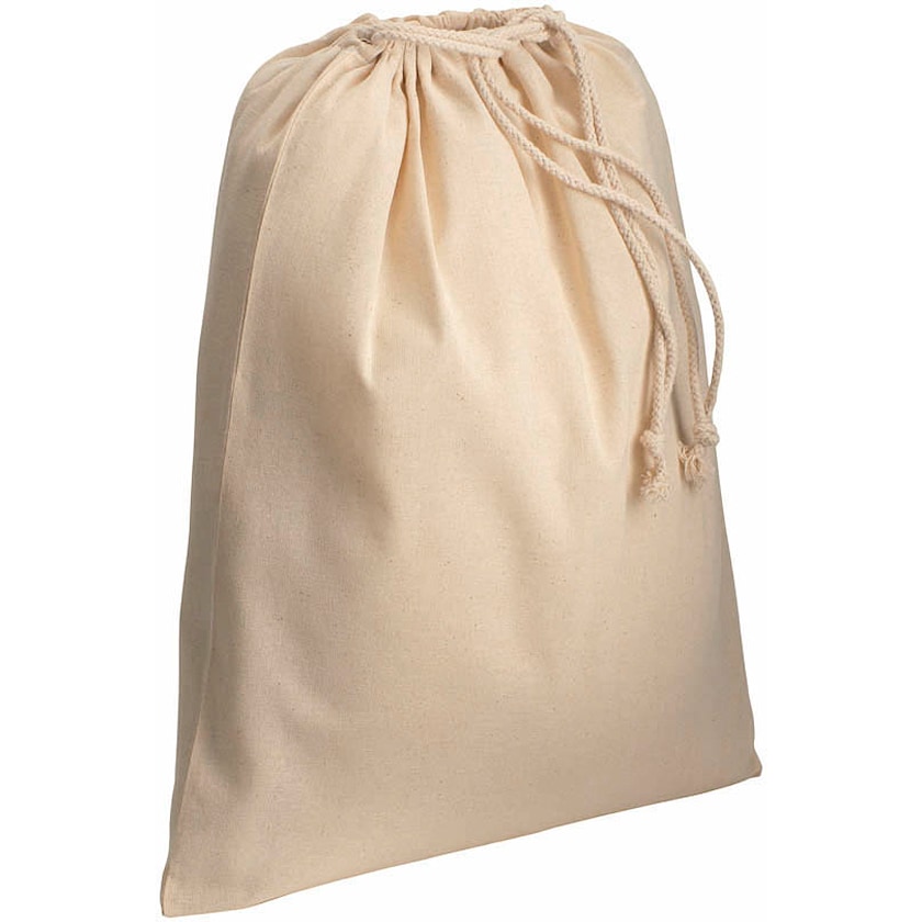 Stor bomuldspose af 120 gram bomuldstof. Posen er naturfarvet og har snørelukning.