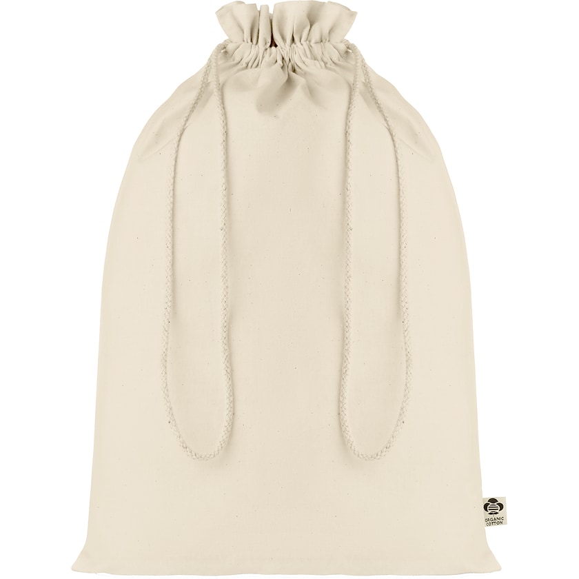 Stor gavepose i økologisk bomuld. Posen er fremstillet af et naturfarvet 105 grams stof. På den ene side er der en etiket som viser at posen er fremstillet af økologisk bomuld.